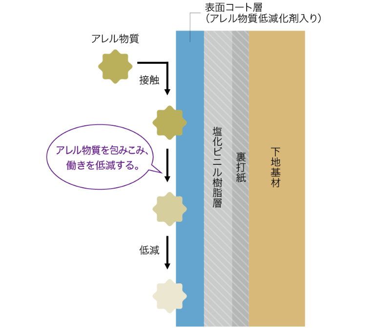 • 吸着して働きを抑える: 壁紙に付着した花粉やダニの死骸などのアレル物質(アレルゲン)を吸着し、その働きを抑制します。