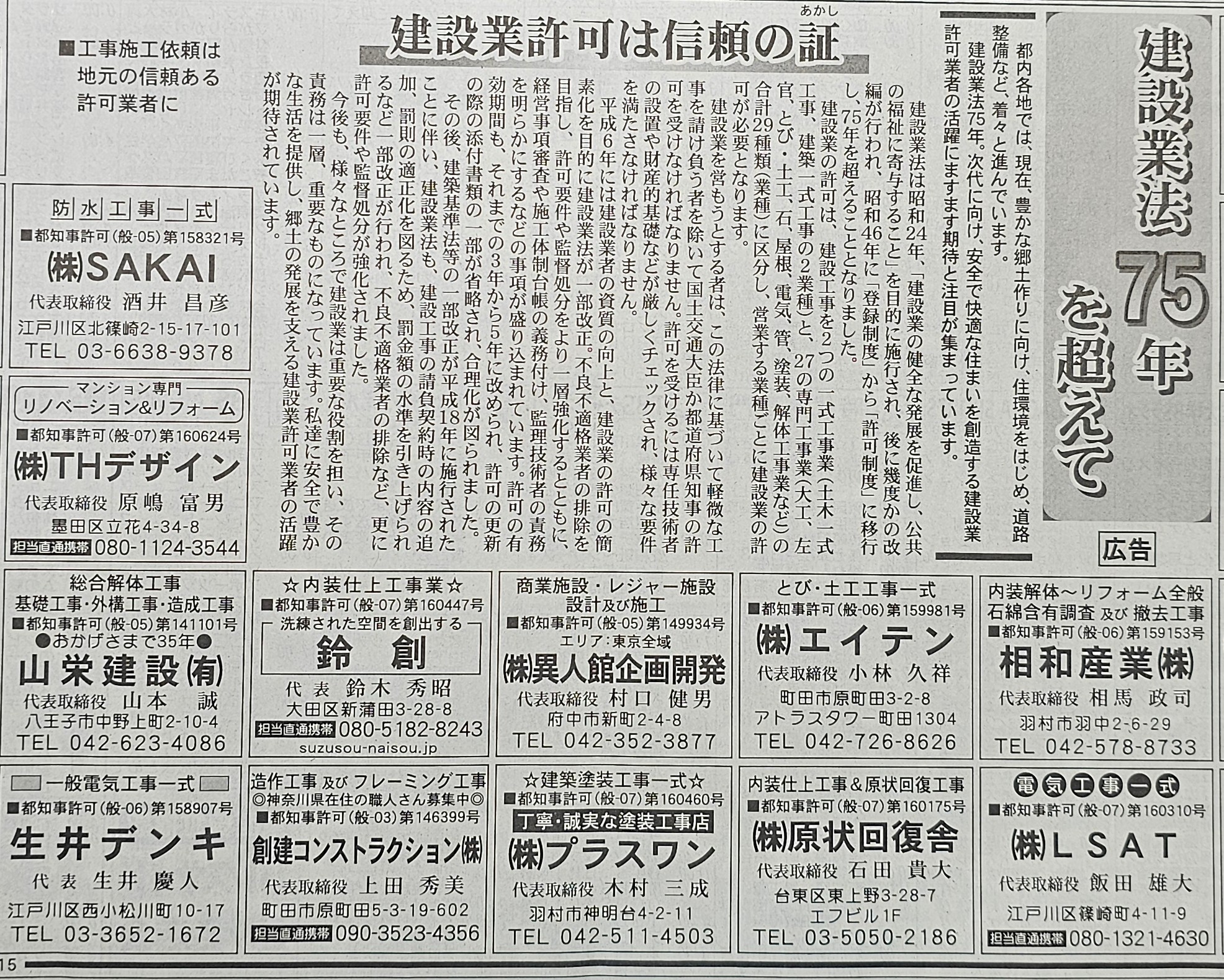 毎日新聞令和7年10月29日朝刊【建設許可は信頼の証】に鈴創もご掲載頂きました